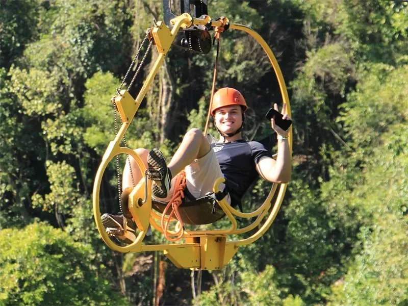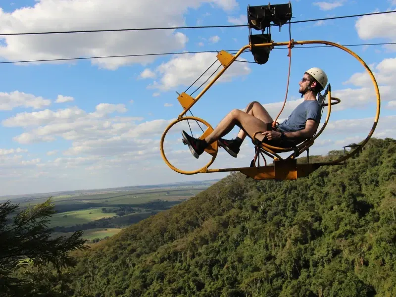 A Skybike é uma aventura importada e exclusiva do Viva Brotas, feita para quem quer sentir a liberdade em sua forma mais pura. Imagine pedalar a 70 metros de altura, com o vento no rosto e uma vista panorâmica absurda do vale. Você atravessa as cachoeiras suspenso por um cabo que suporta mais de 10 toneladas — segurança total para você viver um momento que mistura coragem, adrenalina e a sensação surreal de estar literalmente pedalando entre as nuvens.